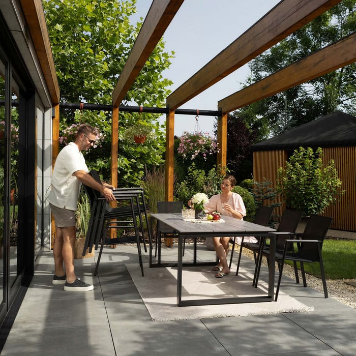 Židle jsou navrženy tak, aby jejich tvar umožňoval stohování, tedy položení jedné židle na druhou. Toto vrstvené uspořádání usnadňuje skladování zahradního nábytku, když se nepoužívá. Jedná se o praktické řešení, které vám umožní ušetřit spoustu místa, obzvláště užitečné při omezeném úložném prostoru.