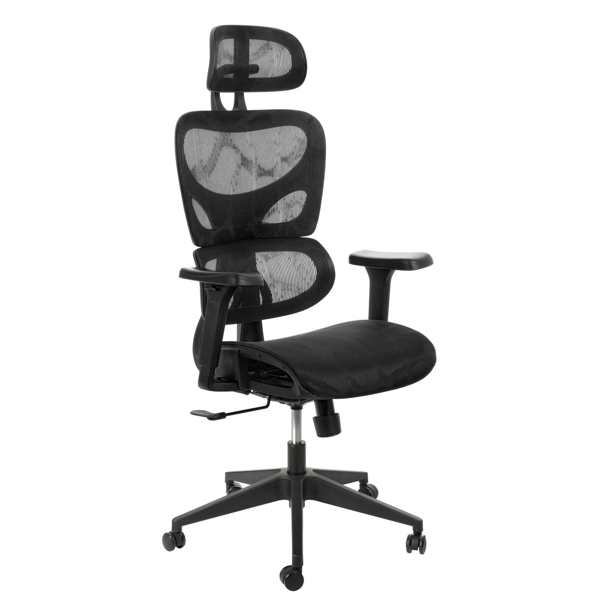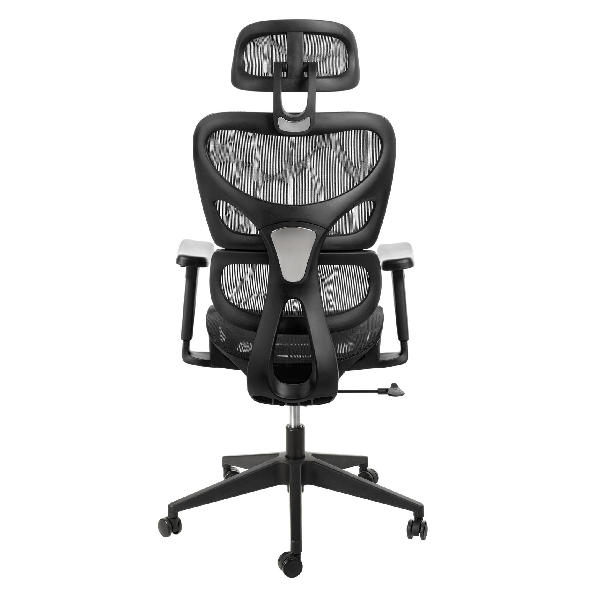 Moderner ergonomischer Bürostuhl mit 2D-Kopfstütze, 4D-Armlehnen, Lordosenstütze, atmungsaktivem Netzbezug, TILT-Mechanismus und stabilem Nylongestell.