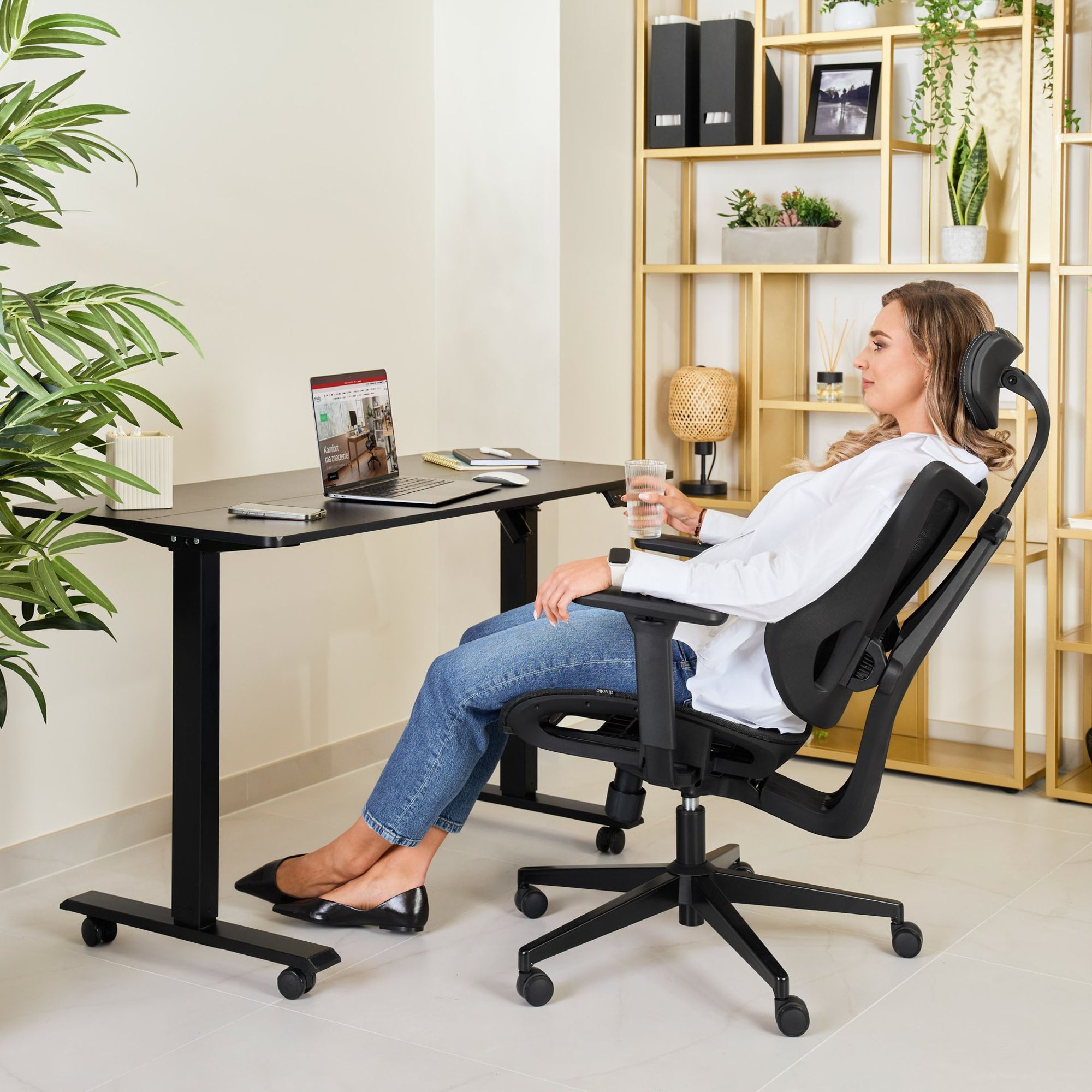 Der Drehstuhl verfügt über eine Gasdruckfeder Klasse 3 mit einem Hub von 100 mm, die eine effiziente Sitzhöhenverstellung ermöglicht. Die Rückenlehne hingegen verfügt über eine Kippfunktion mit Arretierung in drei Positionen. Dies sorgt für einen schnellen Wechsel der Position – von der Arbeit bis zum Entspannen – ohne dabei die Rückenunterstützung zu verlieren.