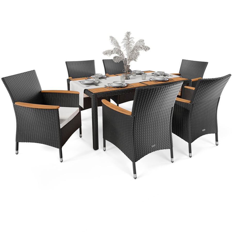 Das Gartenmöbel-Set VERONA von di volio eignet sich hervorragend für den Garten oder die Terrasse. Mit dieser Sitzgruppe können Sie sich an der frischen Luft entspannen oder eine Party für Gäste organisieren und das schöne Wetter genießen. Das Set besteht aus 6 Sesseln mit Armlehnen aus Akazienholz und einem großen Familientisch mit einer Holzplatte. Weiche Sitzkissen sorgen für mehr Komfort. Die Outdoor-Möbel sind aus einem Polyrattan-Geflecht gefertigt, das eine hohe Widerstandsfähigkeit gegen Witterungseinflüsse und UV-Strahlen aufweist. Die Polyrattan-Fasern werden von Hand geflochten, was für eine präzise Verarbeitung sorgt. Das minimalistische, moderne Design der Gartenmöbel VERONA sorgt dafür, dass sie sich perfekt in jeden Raum einfügen, unabhängig von Einrichtung und Stil.