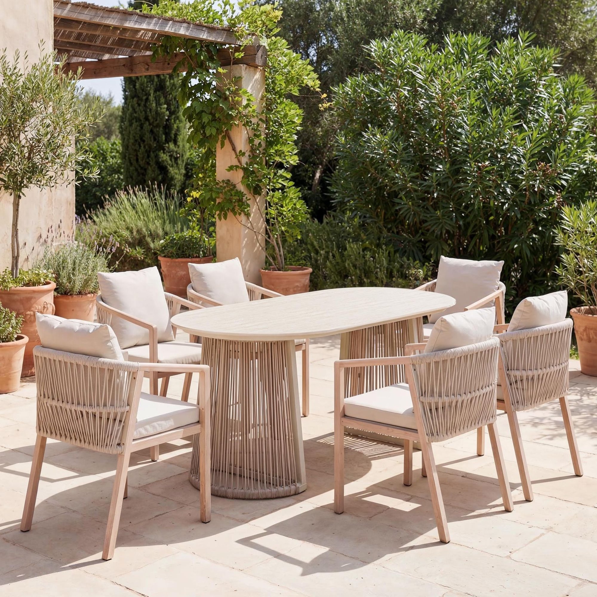Das Gartemöbel-Set Arneli im beigen Farbton schafft einen Ort, an den Sie immer wieder zurückkehren möchten. Nehmen Sie Platz am großzügigen Tisch mit den Maßen 180 × 90 cm und spüren Sie, wie gemeinsame Momente zu etwas Besonderem werden. Die Tischplatte aus Sinterstein vereint Eleganz mit hoher Widerstandsfähigkeit gegen Kratzer und Flecken. Der Tisch steht stabil auf einem soliden Gestell und eignet sich sowohl für den Garten als auch für den Balkon oder die Terrasse. Im Set sind 6 Stühle mit ergonomischen und bequemen Polstern enthalten. Es handelt sich um ein 6-Personen-Essset, an dem Sie besondere Momente im Freien genießen können.