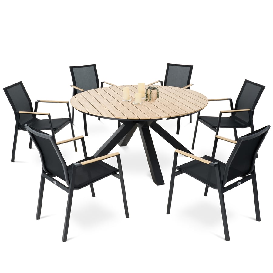 Das Gartenmöbel-Set Ozzano von di volio ist ein Vorschlag für alle, die elegante, komfortable und langlebige Möbel für Garten oder Terrasse suchen. Die Sitzgruppe besteht aus einem großen Esstisch und sechs Stühlen. Sie verleiht dem Außenbereich eine praktische Dimension. Egal, ob Sie sich im Alltag im Freien entspannen, mit der Familie treffen oder eine Party planen – diese Möbel sind für jeden Anlass geeignet. Die runde Form des Tisches fördert ein entspanntes Gespräch und die Integration aller Gäste. Die Stühle mit Armlehnen und ergonomisch geformten Sitzflächen und Rückenlehnen garantieren auch bei längerem Gebrauch Komfort. Die Outdoor-Möbel zeichnen sich nicht nur durch ihre Funktionalität, sondern auch durch ihre Haltbarkeit und Wetterbeständigkeit aus. Dank der Kombination aus Aluminiumkonstruktion, Elementen aus Kunstholz und Gewebe Textilene nehmen die Möbel keinen Schaden, selbst wenn sie Feuchtigkeit, niedrigen oder hohen Temperaturen oder UV-Strahlen ausgesetzt sind. Die verwendeten Materialien sorgen zudem für eine schöne Ästhetik der Möbel und verleihen ihnen ein modernes und zugleich universelles Aussehen. So fügt sich die Sitzgruppe Ozzano perfekt in jede Einrichtung ein.