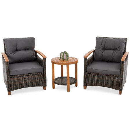 Gartenmöbel Arde Braun/Graphite von di volio, Set für 2 Personen, aus Polyrattan und massivem Akazienholz, witterungsbeständig, inkl. Kissen.
