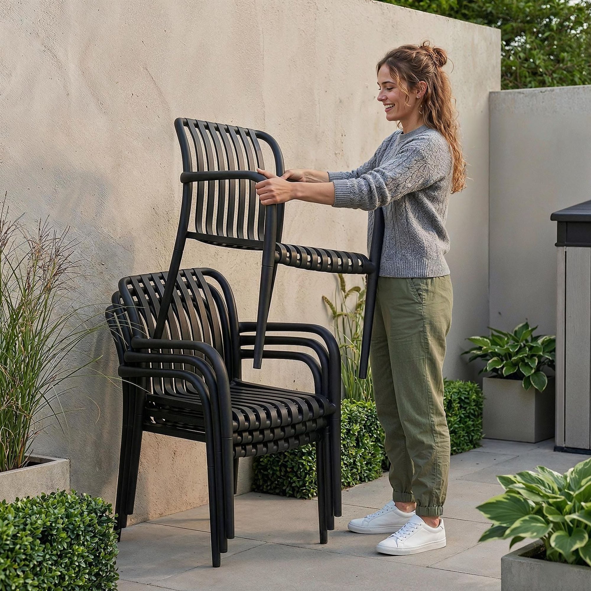 Das Set aus 4 Gartenstühlen Carisi DV-176GC in Schwarz überzeugt durch modernes Design, hohen Komfort und solide Verarbeitung. Die schlanke, luftige Konstruktion im skandinavischen Stil verleiht dem Außenbereich Eleganz und einen zeitgemäßen Charakter. Die Stühle eignen sich hervorragend für Garten, Terrasse und Balkon. Vertikale Streben in der Rückenlehne verbessern die Belüftung und sorgen auch an heißen Tagen für angenehmen Sitzkomfort. Armlehnen stützen die Arme und ermöglichen entspanntes Sitzen am Tisch. Das robuste, UV-geschützte PP-Material schützt die Möbel vor Sonne, Feuchtigkeit und Temperaturschwankungen.