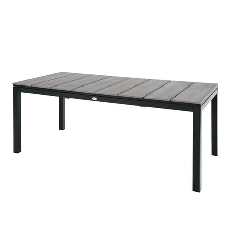 Ausziehbarer Outdoor Tisch aus Aluminium mit PS-Holzoptikplatte. Leicht, robust, wetterfest und ideal für gesellige Abende im Garten.