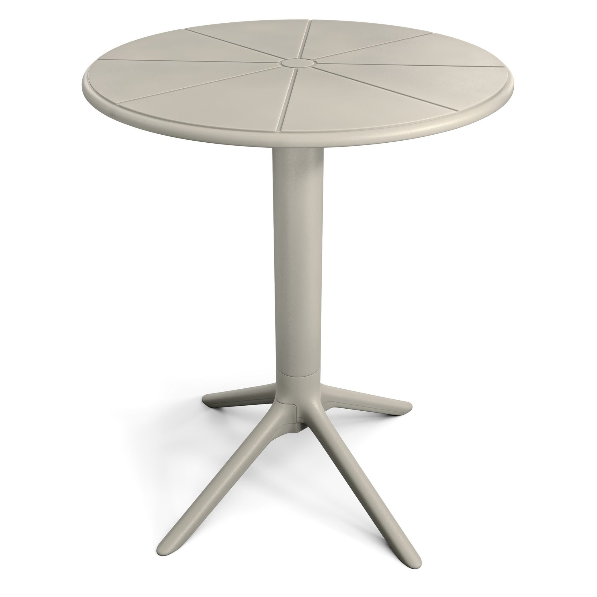 Der Balkontisch Dego steht auf einem stabilen, einzelnen Tischbein mit vierarmigem Fußgestell. Dieses sorgt auch auf unebenem Untergrund – wie Rasen, Pflastersteinen oder Terrassenplatten – für sicheren Stand. Zusätzlich ermöglichen vier höhenverstellbare Füße ein exaktes Ausrichten des Tisches. Mit einem Durchmesser von 60 cm und einer Höhe von 76 cm bietet er komfortabel Platz für zwei Personen – ideal für den Morgenkaffee oder entspannte Abende. Die Tischplatte ist mit einem dezenten, strahlenförmigen Muster verziert, das an eine Zitrusscheibe erinnert und dem Tisch eine leichte, moderne Note verleiht. Ein runder Gartentisch, der praktische Funktion mit attraktivem Design verbindet.