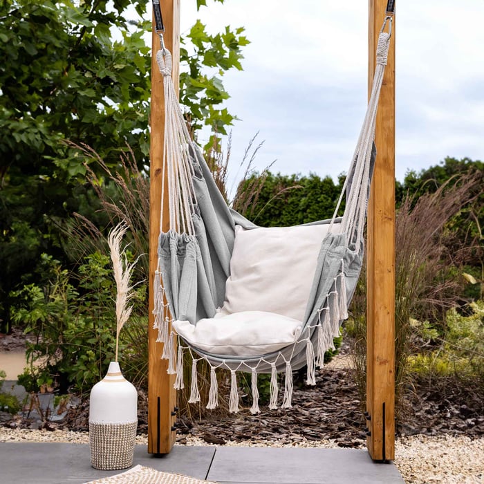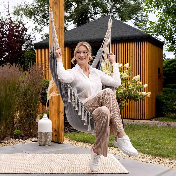Der Hängemattensitz des Hängesessels umhüllt Sie angenehm und sorgt für ein wohltuendes Sitzgefühl beim entspannten Schaukeln. Zudem ist der Hängesessel mit zwei farblich angepassten Kissen ausgestattet, die den Rücken stützen, die Position stabilisieren und ein bequemes Sitzen ermöglichen. In der praktischen Innentasche können Sie ein Buch, Ihr Smartphone oder einen Snack verstauen. Mit der mitgelieferten Flaschenhülle haben Sie auch Ihr Lieblingsgetränk immer griffbereit.