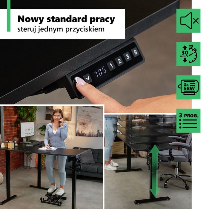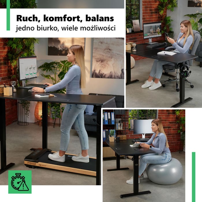 To rozwiązanie ma ogromne znaczenie dla zdrowia: częsta zmiana pozycji podczas pracy poprawia krążenie, redukuje zmęczenie, przeciwdziała bólom pleców i karku, a także pozytywnie wpływa na koncentrację. Co więcej, Montaro świetnie współpracuje z bieżnią podbiurkową, co czyni z niego nowoczesną i zdrową alternatywę dla klasycznego stanowiska pracy.
