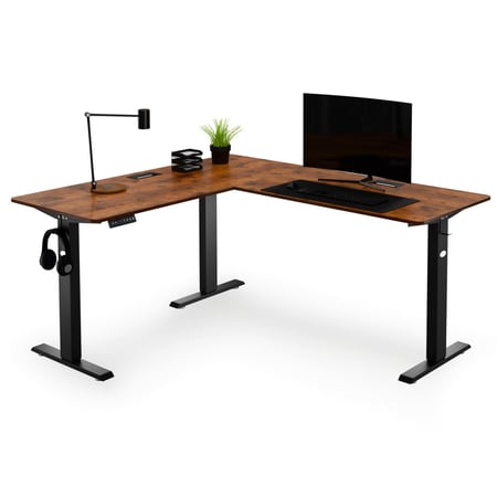 Montaro brązowe lewostronne – biurko narożne z elektryczną regulacją wysokości i dużą przestrzenią roboczą, idealne do pracy, nauki i gamingu.