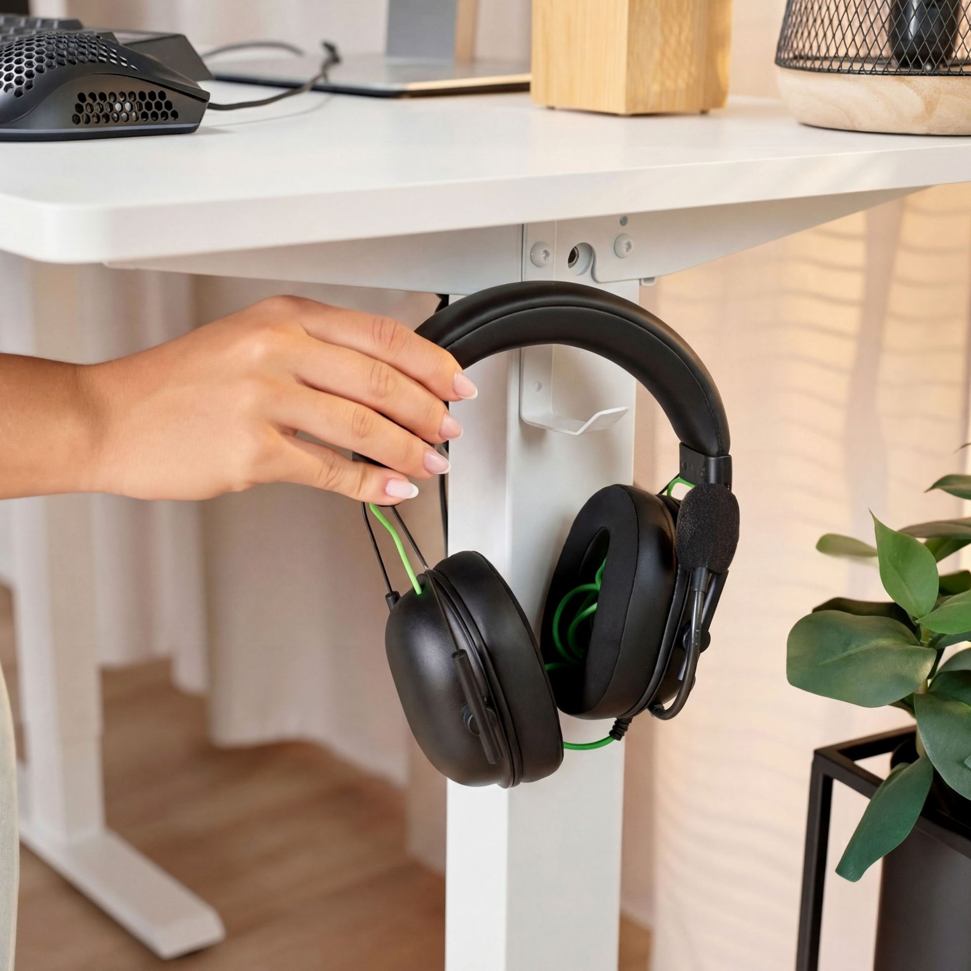 W zestawie znajdziesz także dwa stalowe haczyki montowane z boku biurka, idealne na słuchawki, torbę czy plecak. Dodatkowym udogodnieniem są regulowane stopki, które pozwalają wypoziomować biurko, nawet jeśli stoi na nierównej podłodze.