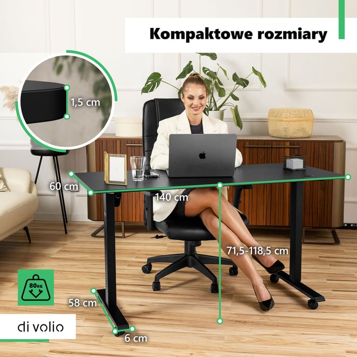 Blat o wymiarach 140 × 60 cm, wykonany z laminowanej płyty wiórowej, zapewnia odpowiednią przestrzeń roboczą na komputer, monitory oraz niezbędne akcesoria biurowe. Powierzchnia blatu w kolorze czarnym, zachowuje trwałość i estetyczny wygląd nawet przy codziennym, intensywnym użytkowaniu, a jej gładka powierzchnia jest łatwa do utrzymania w czystości. Dodatkowo, blat wyposażony został w przepust na kable, ułatwiający sprawną organizację przewodów i ich ukrycie oraz praktyczny uchwyt do zawieszenia słuchawek lub plecaka.