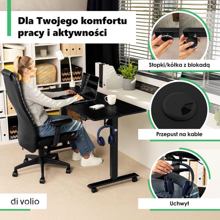 Do zestawu dołączone są cztery kółka, które można zamontować zamiast tradycyjnych podstawek. Dzięki temu mebel staje się mobilny, łatwy do transportu i przestawiania, co umożliwia szybkie przearanżowanie przestrzeni roboczej praktycznie bez wysiłku. Kółka wyposażone są w system blokujący, który pozwala na stabilne ustawienie biurka w wybranym miejscu, zapobiegając przypadkowemu przesuwaniu. Dzięki temu możesz mieć pewność, że biurko pozostanie na swoim miejscu w trakcie pracy.