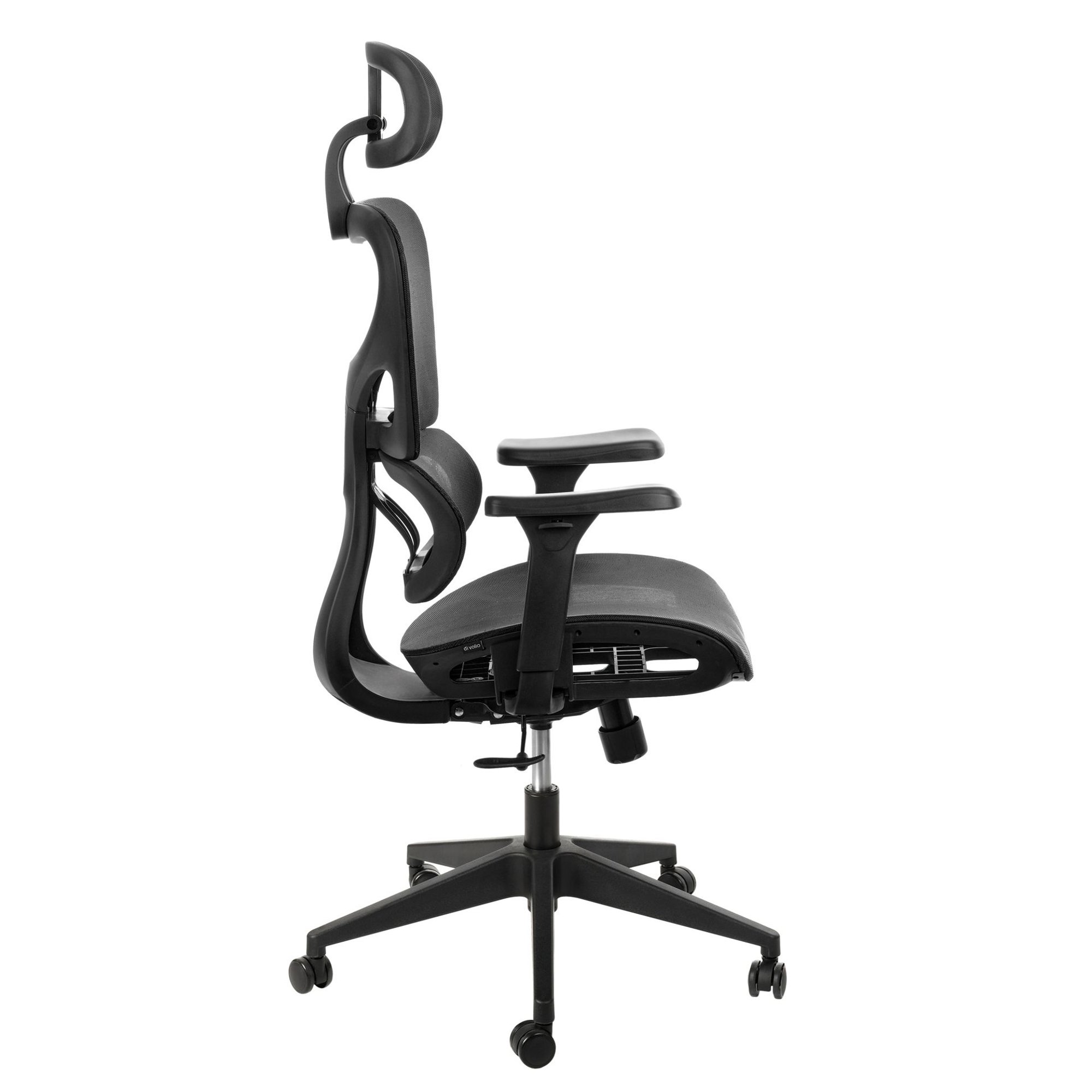 Fotel biurowy Vataro oparto na solidnej czarnej ramie i wyposażono w wysokie oparcie oraz duży zagłówek wykonany z przewiewnej siatki mesh w kolorze czarnym. Innowacyjny zagłówek 2D umożliwia regulację wysokości oraz kąta nachylenia, dzięki czemu użytkownik może z łatwością dopasować jego pozycję do własnej sylwetki i preferencji. Takie rozwiązanie pozwala odciążyć kark i szyję nawet podczas długotrwałego siedzenia przed ekranem komputera.