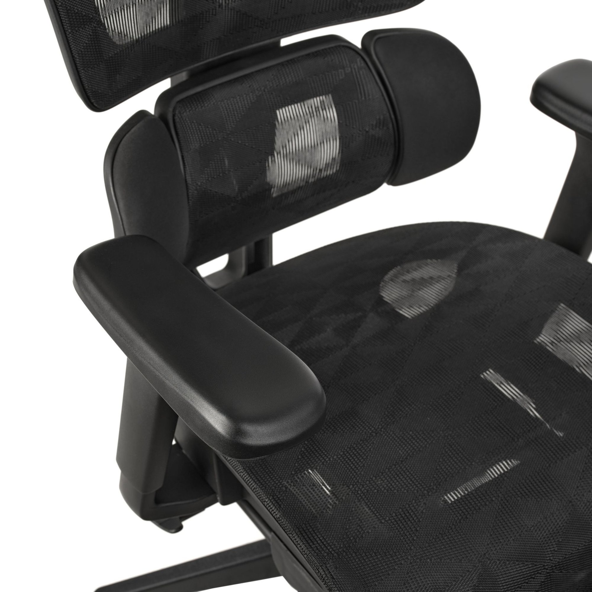 Zagłówek w systemie 2D oferuje możliwość regulacji wysokości oraz kąta nachylenia, co pozwala idealnie dopasować jego pozycję do wzrostu użytkownika. Konstrukcja zagłówka zapewnia płynne i bezpieczne dopasowanie w dwóch płaszczyznach, wspierając odcinek szyjny kręgosłupa i zmniejszając napięcia mięśniowe. Fotel wyposażono również w ruchome czarne podłokietniki 4D z twardą powierzchnią, umożliwiające regulację w czterech kierunkach: góra/dół, przód/tył, obrót 360°, lewo/prawo. Taka funkcjonalność pozwala zachować prawidłową postawę ciała i odciążyć barki oraz nadgarstki.