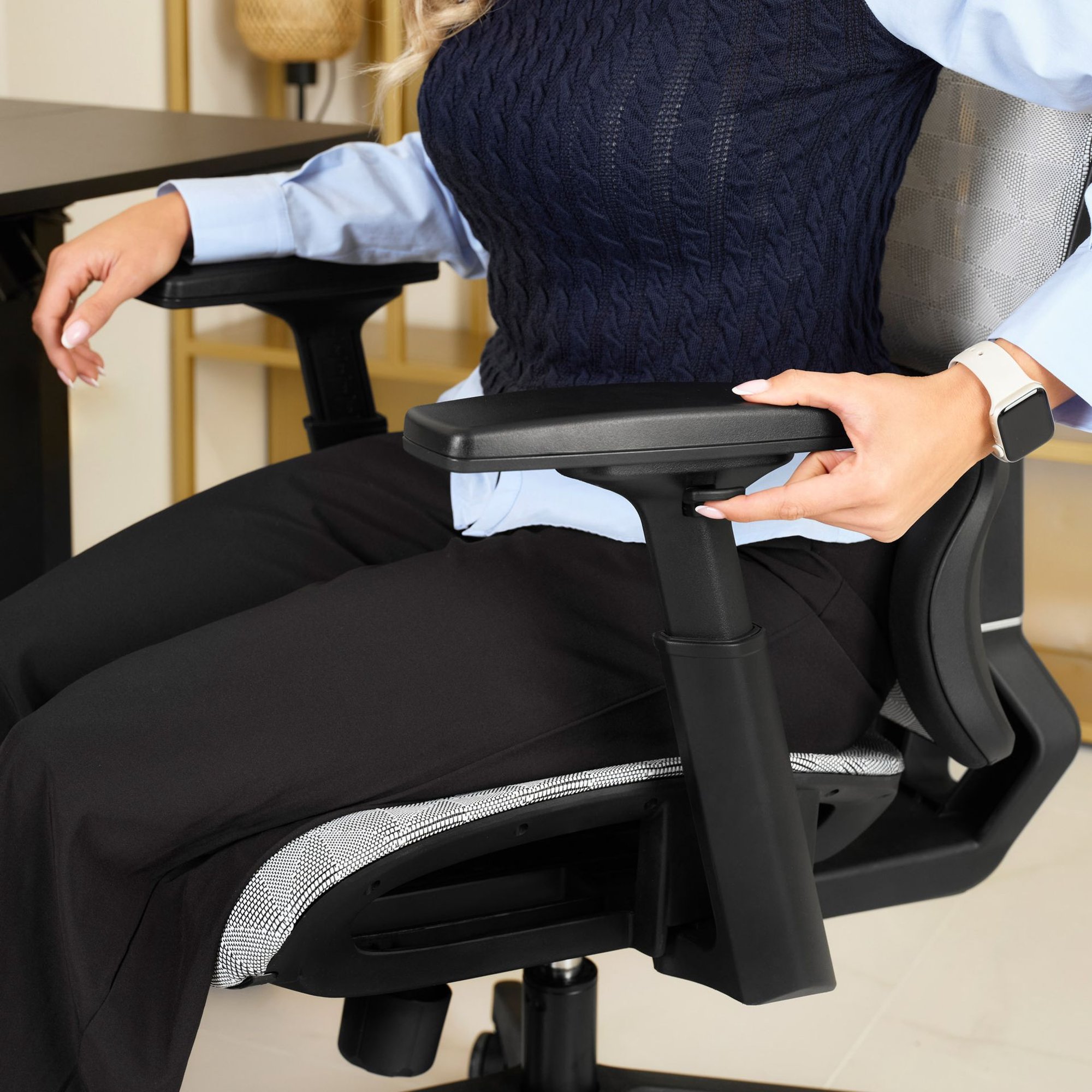 Preda to fotel, który można z łatwością dostosować do własnych potrzeb. Zagłówek 2D oferuje możliwość regulacji zarówno wysokości, jak i kąta nachylenia, dzięki czemu idealnie wspiera odcinek szyjny kręgosłupa. Podłokietniki wykonane zostały z miękkiego materiału i oferują pełną funkcjonalność 4D – regulację góra/dół, przód/tył, obrót o 360° oraz ruch w lewo/prawo. Zarówno podłokietniki, jak i podstawa z kółkami, utrzymane są w eleganckim czarnym kolorze, nadając fotelowi nowoczesny i profesjonalny wygląd.