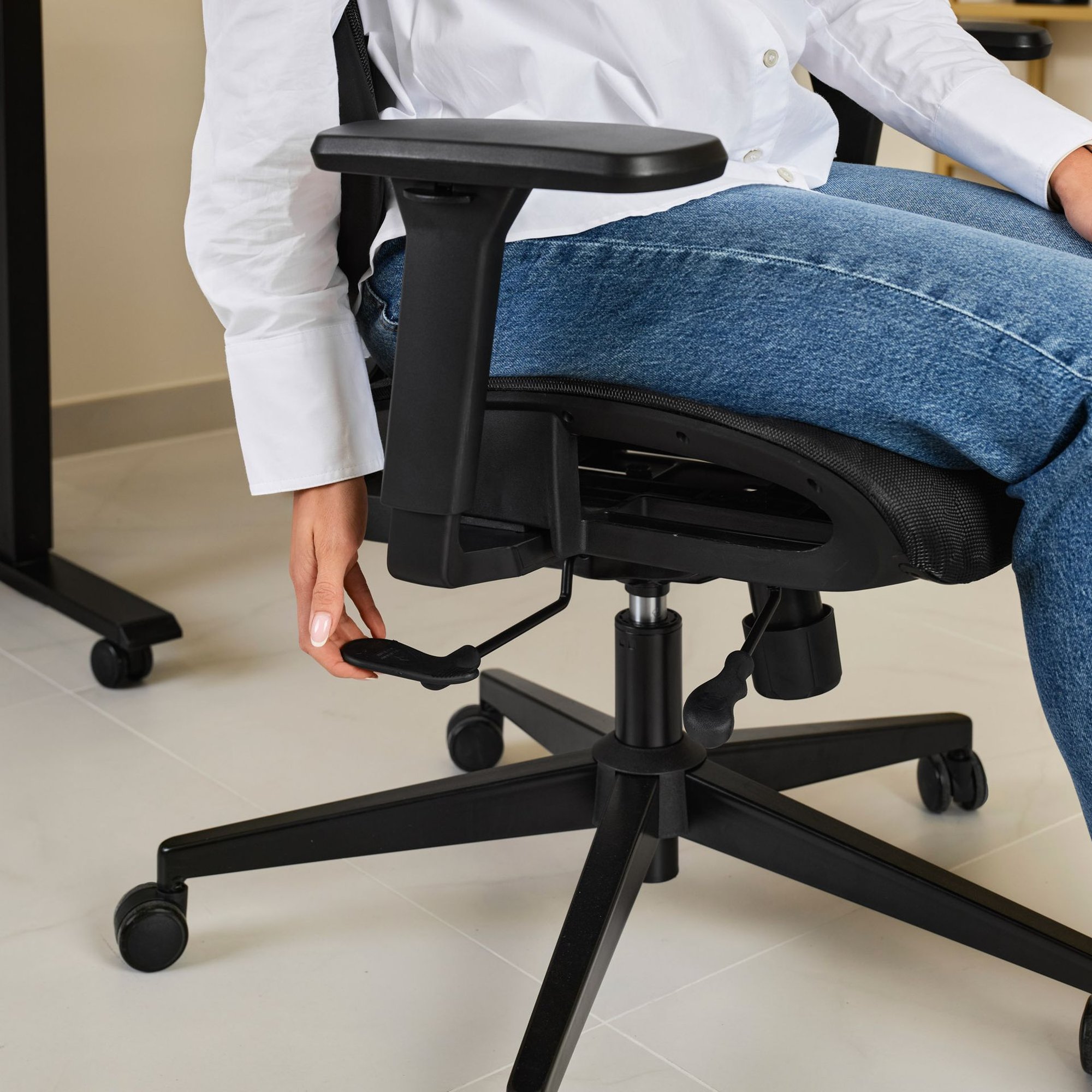 Siatkowana tapicerka zapewnia trwałość i pełną wentylację, a siedzisko z „pustym” profilem i pianką pod kolanami gwarantuje wygodę i swobodny przepływ powietrza. Miękki, szeroki podłokietnik wspiera przedramiona, a praktyczny i dyskretny wieszak na ubrania umieszczony z tyłu oparcia pozwala zachować porządek przy stanowisku pracy.