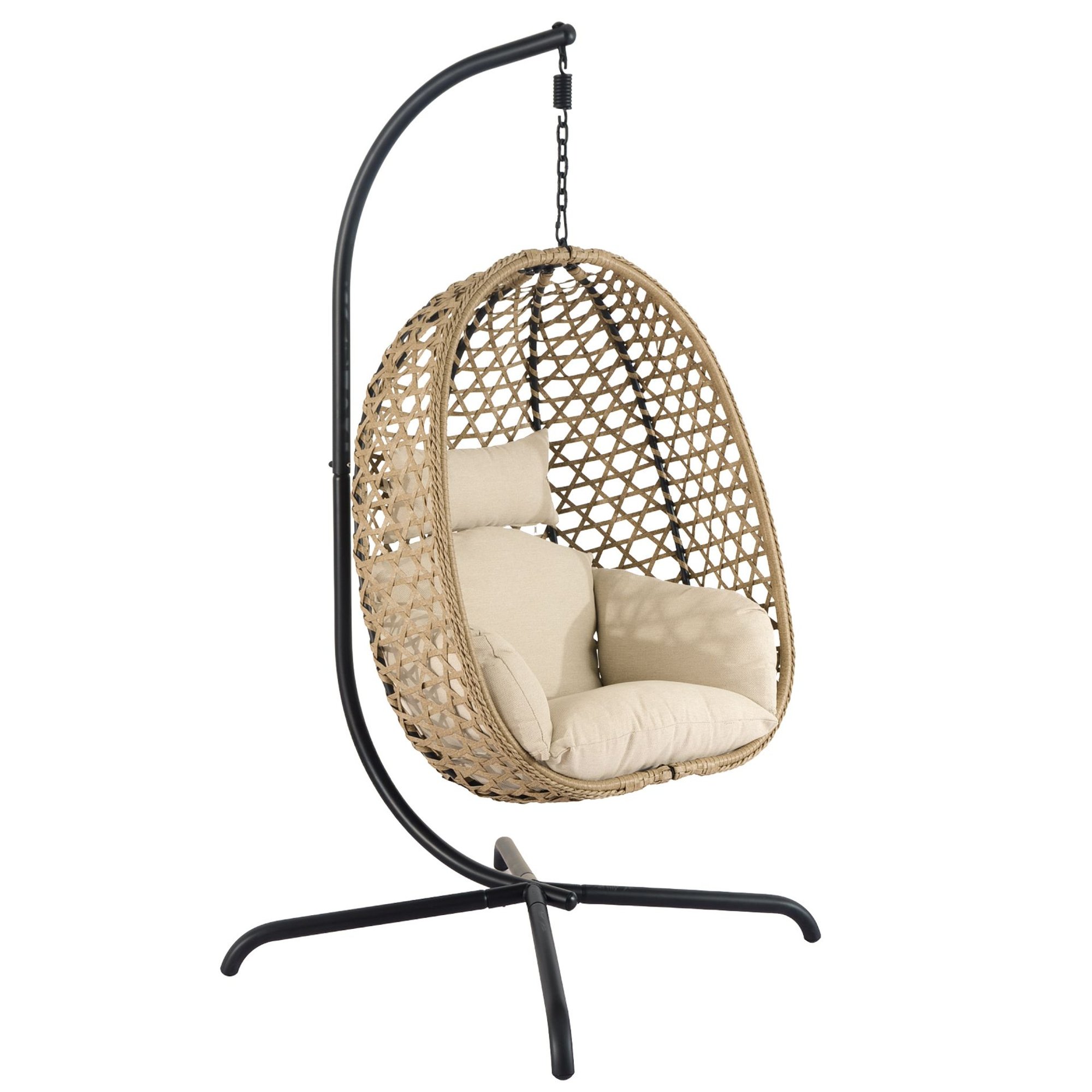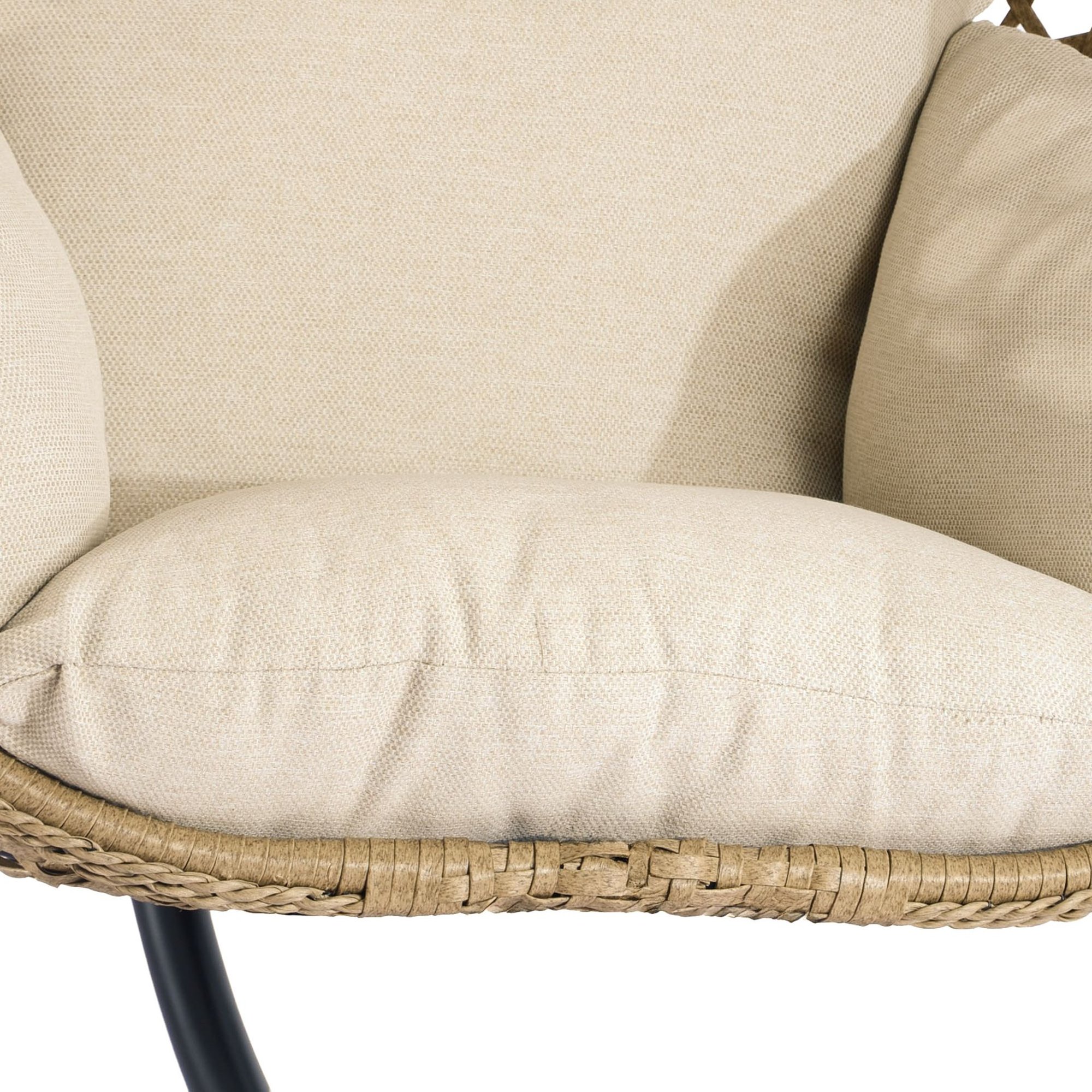 Siedzisko wykonano z wytrzymałego technorattanu, odpornych na warunki atmosferyczne, w eleganckim kolorze brązowym. Duża, gruba poduszka na fotel wiszący o grubości 15 cm została zaprojektowana tak, aby równomiernie podpierać plecy i siedzisko, zwiększając komfort nawet podczas długiego wypoczynku. Miękkie wypełnienie z bawełny PP sprężynuje pod ciężarem ciała i szybko wraca do pierwotnego kształtu, a ukryty zamek błyskawiczny ułatwia zdejmowanie poszewki do czyszczenia. Zaokrąglone siedzisko tworzy typowy fotel wiszący kokon, w którym odpoczniesz po pracy lub podczas popołudniowej kawy. Zrelaksujesz się i odprężysz w komfortowym wnętrzu lub na świeżym powietrzu.