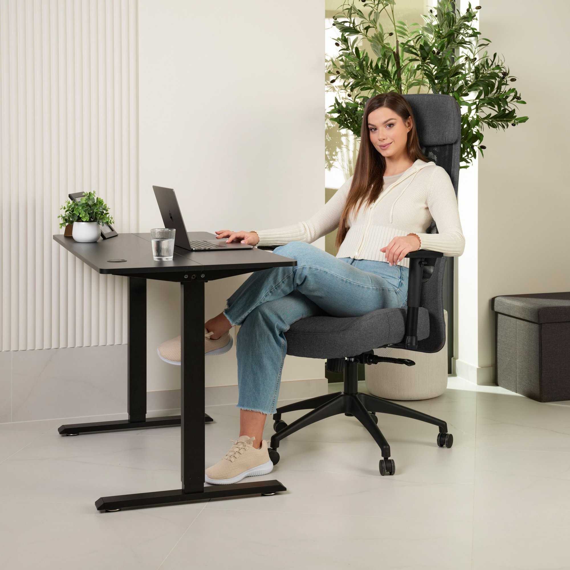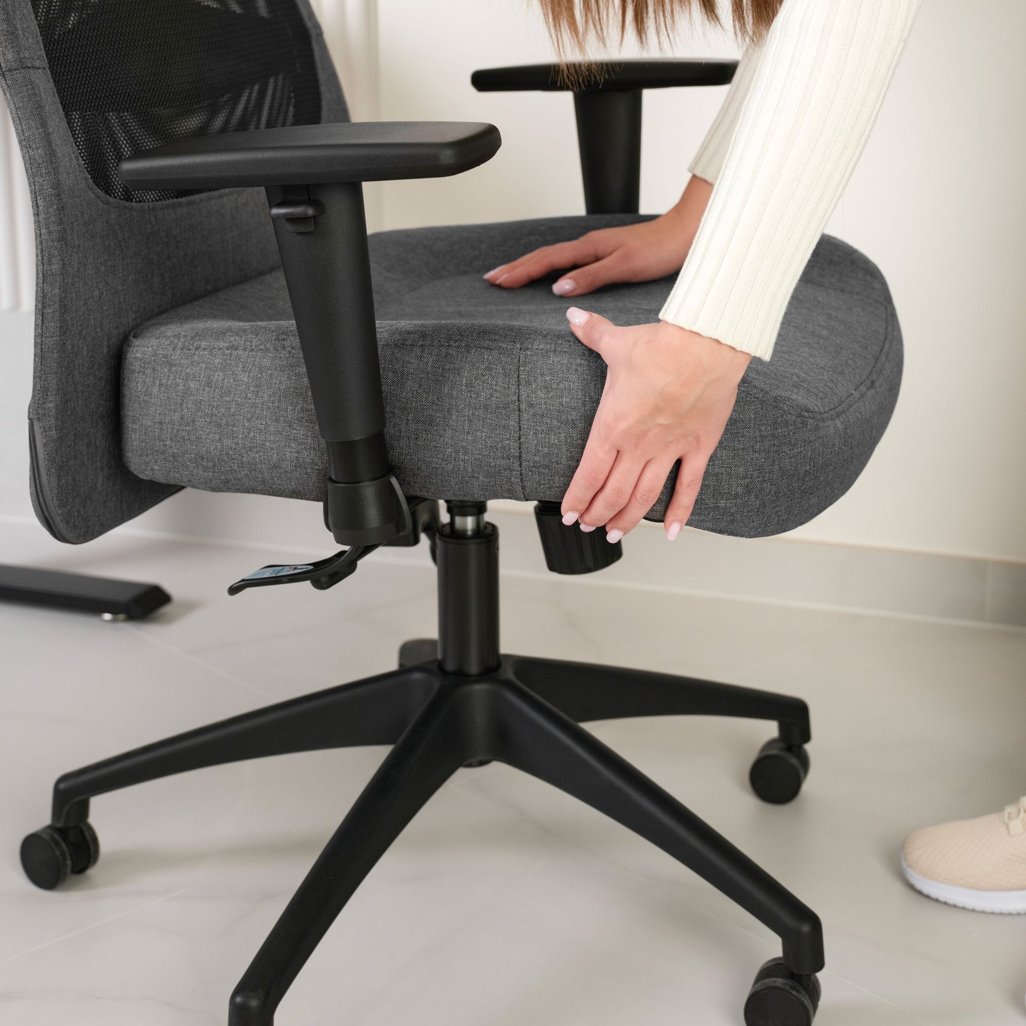 Siedzisko z pianki o grubości 10 cm jest miękkie, sprężyste i wygodne nawet po wielu godzinach pracy. Pokryto je eleganckim, ciemnoszarym materiałem, który jest odporny na ścieranie i łatwy w utrzymaniu. Podstawa z czarnego, matowego nylonu gwarantuje stabilność. Fotel ma podnośnik gazowy klasy 3 z płynną regulacją wysokości oraz ciche kółka PU o średnicy 50 mm, które dobrze sprawdzają się na każdej powierzchni. To solidny, wygodny i stylowy fotel ergonomiczny, który sprawdzi się zarówno w biurze, jak i w domowym gabinecie.