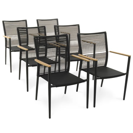 Zestaw 6 krzeseł ogrodowych wykonanych z wysokiej jakości aluminium w połączeniu z okrągłym, czarnym technorattanem nadaje krzesłom nowoczesny wygląd.