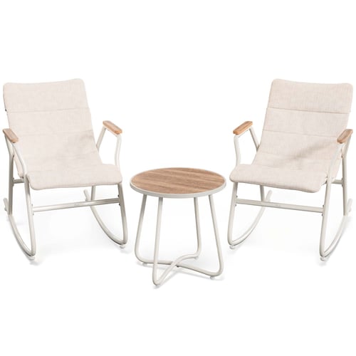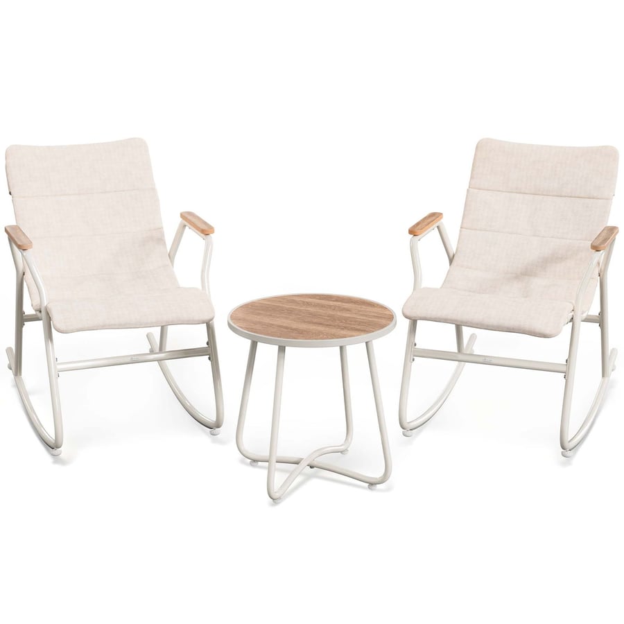 Zestaw mebli ogrodowych Ricione DV-144GF kremowy pozwala zwolnić tempo na tarasie lub w ogrodzie. Ten nowoczesny zestaw ogrodowy tworzy kameralną przestrzeń do odpoczynku blisko natury. Siadasz w jednym z dwóch foteli bujanych i czujesz kojący rytm delikatnego kołysania. Miękkie, 4-centymetrowe poduszki w kremowej tkaninie z ukrytym zamkiem zwiększają wygodę, a beżowe podłokietniki z polywoodu dobrze znoszą słońce i deszcz. Obok stawiasz stolik kawowy ogrodowy z hartowanym szkłem i beżowym nadrukiem 3D, który łatwo utrzymujesz w czystości. Regulowane nóżki zapewniają stabilność nawet na nierównej powierzchni. Wybierasz model Ricione i tworzysz własny zestaw relaksacyjny do ogrodu.