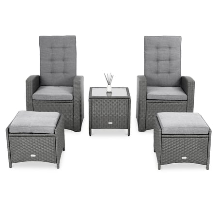 Zestaw mebli ogrodowych z rozkładanymi fotelami i miękkimi poduchami. W komplecie niewielki stolik z półką oraz dwa podnóżki. Idealny jako zestaw mebli balkonowych.
