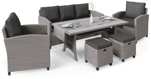 Genova to zestaw eleganckich i wygodnych mebli ogrodowych, dzięki któremu stworzysz w swoim ogrodzie i na tarasie przestrzeń do wypoczynku, spotkań z najbliższymi i wspólnych posiłków na świeżym powietrzu. Komplet składa się z trzyosobowej sofy, dwóch foteli, dwóch puf oraz jadalnianego stołu z szerokim blatem . Siedziska i oparcia mebli wyposażone zostały w miękkie, poduszki, które zapewniają komfort podczas siedzenia. Dzięki zastosowaniu trwałych materiałów wykonania - technorattanu, stali malowanej proszkowo i tworzywa imitującego drewno (polywood), meble Genova są odporne na działanie warunków atmosferycznych , dlatego nie musisz obawiać się o ich uszkodzenie lub odbarwienie pod wpływem działania wody i promieni słonecznych. Plecionka z wysokiej jakości włókien technorattanowych o zaokrąglonym kształcie, nadaje meblom naturalny wygląd, dzięki czemu zestaw prezentuje się bardzo estetycznie. Połączenie plecionki i nowoczesnych, prostych form sprawia, że zestaw mebli Genova zyskuje uniwersalny charakter i dobrze wpisuje się zarówno w modernistyczne, jak i tradycyjne przestrzenie.