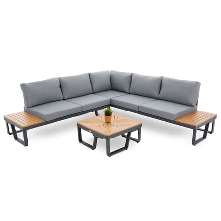 Zestaw mebli ogrodowych Veledo cechuje aluminiowa konstrukcja, drewniane akcenty, wygodne poduszki i narożnik ogrodowy złożony z modułowych sof. Ponadczasowy, minimalistyczny design i komfort w Twoim ogrodzie!