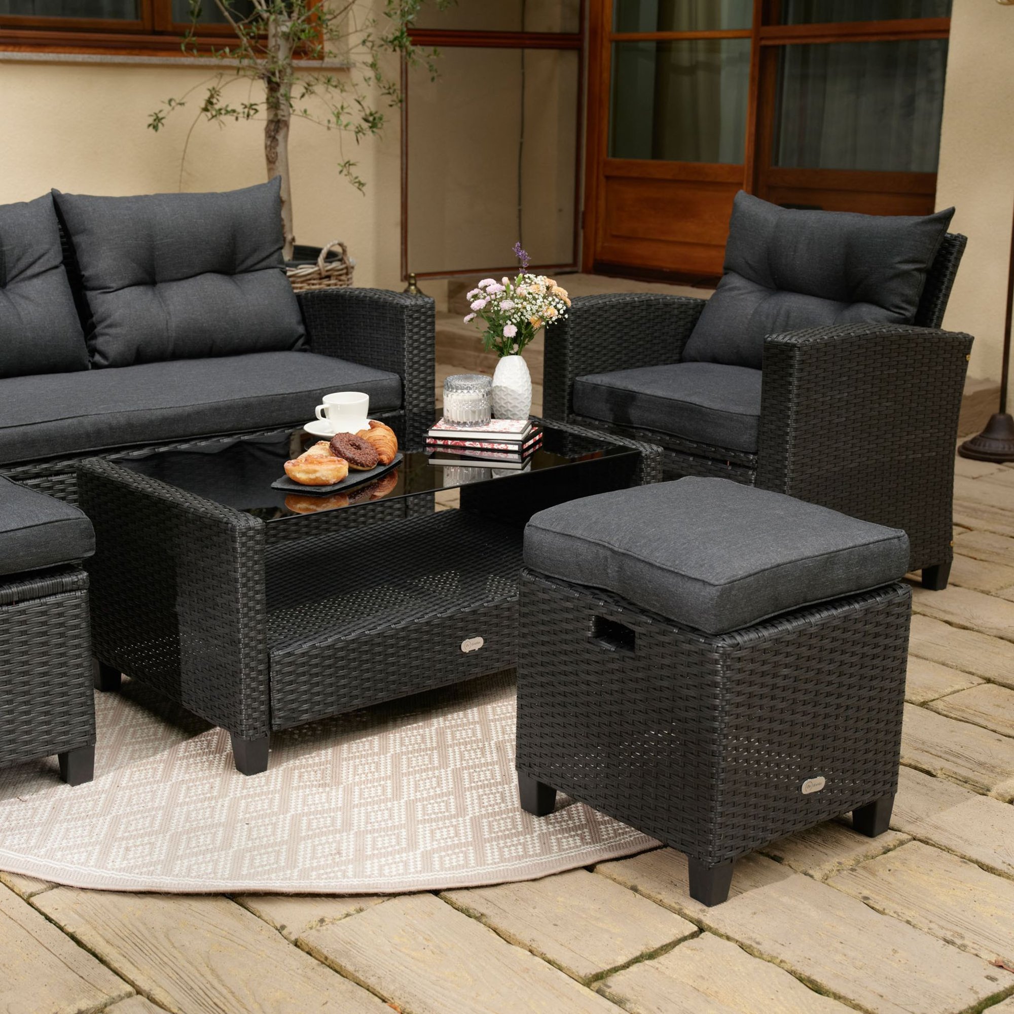Meble ogrodowe Dalmia di volio w kolorze czarnym z miękkimi poduszkami o impregnowanych poszewkach. Komplet stanowi wygodny, duży narożnik, fotel, pufa oraz stolik.