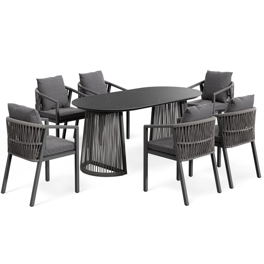 Zestaw mebli ogrodowych Arneli w eleganckim szarym odcieniu tworzy przestrzeń do spędzania wspólnych chwil. Zasiądź z bliskimi przy przestronnym stole 180 × 90 cm i poczuj, jak posiłki, rozmowy i wspólny relaks nabierają wyjątkowego charakteru. Blat ze spieku kamiennego łączy nowoczesny wygląd z wysoką odpornością na zarysowania, plamy i wilgoć. Stół stoi pewnie na solidnej stalowej podstawie i doskonale komponuje się z otoczeniem ogrodu, balkonu czy tarasu. W komplecie jest 6 wygodnych krzeseł, które dzięki ergonomicznym kształtom i miękkim poduszkom dają komfort jak z foteli wypoczynkowych. To 6‑osobowy zestaw jadalniany, który łączy trwałość metalu z lekkością designu - idealny sposób na spędzanie niezapomnianych chwil na świeżym powietrzu.
