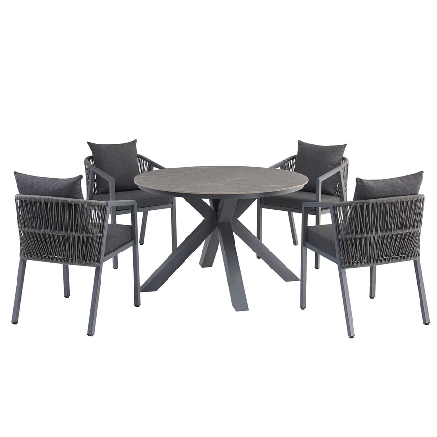 Spędź czas na świeżym powietrzu z zestawem ogrodowym Licato w szarym odcieniu. Zasiądź przy okrągłym stole o średnicy 115 cm i poczuj, jak jego spiekany kamień odporny na zarysowania i zabrudzenia ułatwia codzienne użytkowanie. Stalowa podstawa stoi stabilnie nawet przy obciążeniu do 150 kg, więc możesz jeść i rozmawiać bez obaw o wytrzymałość. Cztery komfortowe krzesła ze stali ocynkowanej i plecionki technorattanowej są odporne na wilgoć i promieniowanie UV, więc wyglądają jak nowe przez wiele sezonów. Miękkie poduszki z piankowym wypełnieniem dają Ci wygodę przez godziny, a każde krzesło wytrzymuje do 120 kg. To meble, przy których relaksujesz się, jesz i tworzysz piękne wspomnienia w ogrodzie, na tarasie czy patio.