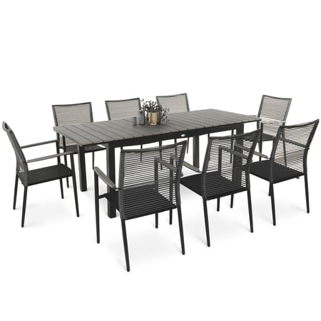Maletto to rozbudowany zestaw mebli ogrodowych, który doskonale sprawdzi się w ogrodzie i na tarasie, umożliwiając nie tylko wygodny wypoczynek dla całej rodziny, ale również organizację przyjęć i spotkań na świeżym powietrzu. Komplet, przeznaczony dla ośmiu osób, składa się z dużego stołu z rozkładanym blatem oraz ośmiu krzeseł z wygodnymi podłokietnikami. Meble zostały wykonane z nowoczesnych materiałów wysokiej jakości, które zapewniają wieloletnią trwałość, odporność na warunki atmosferyczne, wygodę użytkowania i estetyczny wygląd. Konstrukcję stołu i krzeseł, wykonaną z aluminium w eleganckim czarnym kolorze, dopełniają elementy z tworzywa polywood w kolorze szarym oraz technorattanowa plecionka i wytrzymała tkanina Textilene. Prosty, oszczędny design mebli oraz stonowana kolorystyka sprawiają, że komplet Maletto zyskuje nowoczesny, uniwersalny charakter i stylowy wygląd, dzięki któremu dobrze zaprezentuje się w każdej aranżacji.