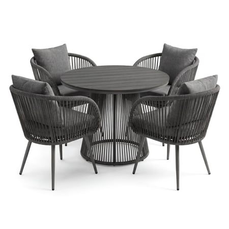 Zestaw zawiera cztery wygodne krzesła ogrodowe o ergonomicznej, kubłowej formie. Każde krzesło ma stabilną konstrukcję ze stali ocynkowanej z powłoką proszkową w kolorze szary mat, dopasowaną kolorystycznie do rattanu. Technorattan w odcieniu szarości jest odporny na wilgoć, promieniowanie UV i codzienne użytkowanie. Miękkie poduszki siedziska z 7-centymetrowej pianki oraz grube, 12-centymetrowe poduszki oparcia z wypełnieniem z polibawełny PP zapewniają wysoki komfort i wygodę nawet podczas długiego siedzenia. To komplet krzeseł, który łączy solidność z nowoczesnym designem.