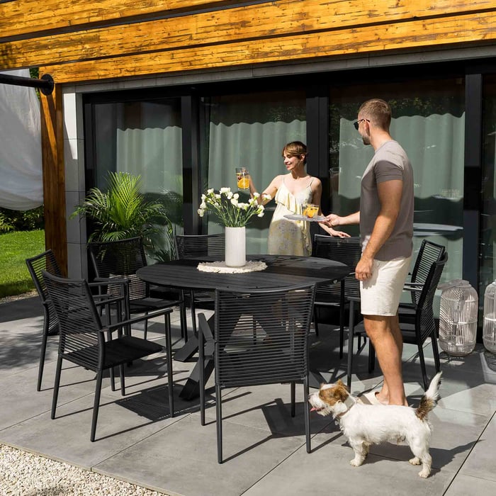 Ottana to praktyczny i elegancki zestaw mebli ogrodowych, dzięki któremu Twój taras lub ogród zyska nowe funkcje i stanie się idealnym miejscem zarówno do relaksu, jak i spotkań z przyjaciółmi, a nawet organizowania rodzinnych przyjęć. Duży stół z przestronnym blatem oraz osiem wygodnych krzeseł z podłokietnikami, zapewnia optymalną ilość przestrzeni i komfortowe miejsca do siedzenia dla domowników i gości. Meble Ottana zostały wykonane z wysokiej jakości materiałów, odpornych na działanie wilgoci, promieni UV oraz zmiennych warunków atmosferycznych, dzięki czemu zachowują swój estetyczny wygląd przez wiele sezonów. Dodatkowe atuty mebli to możliwość sztaplowania krzeseł oraz regulacja stopek nóg stołu, pozwalająca na niwelowanie nierówności podłoża. Uniwersalna stylistyka zestawu, oparta na prostocie form i kolorystyce ograniczonej do czerni i szarości, sprawia, że meble Ottana idealnie komponują się zarówno z nowoczesnymi, jak i klasycznymi aranżacjami ogrodów i tarasów.