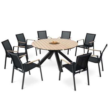 Meble ogrodowe Ozzano 8+1 to nowoczesny zestaw ogrodowy, składający się z okrągłego stołu o średnicy 150 cm oraz ośmiu wygodnych krzeseł z podłokietnikami.