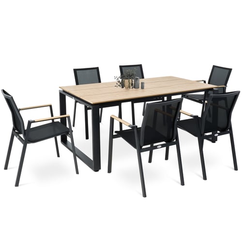 Krzesła w komplecie Perugia zapewniają komfortowy wypoczynek dzięki ergonomicznej formie i zastosowaniu odpowiednio dobranych materiałów wykonania. Siedzisko i oparcie z tkaniny Textilene w kolorze czarnym jest wygodne i na tyle elastyczne, że dostosowuje się do kształtu ciała osoby siedzącej, jednocześnie nie rozciąga się, ani trwale nie odkształca wskutek użytkowania. Siateczkowa struktura tkaniny sprawia, że jest ona przewiewna, przyjemna w dotyku i nie wchłania wilgoci. Lekka aluminiowa rama malowana proszkowo gwarantuje wytrzymałość i stabilność konstrukcji. Jednolitą kolorystykę krzeseł przełamują podłokietniki z tworzywa polywood w kontrastującym, jasnym kolorze, tworząc naturalny akcent kolorystyczny i materiałowy.