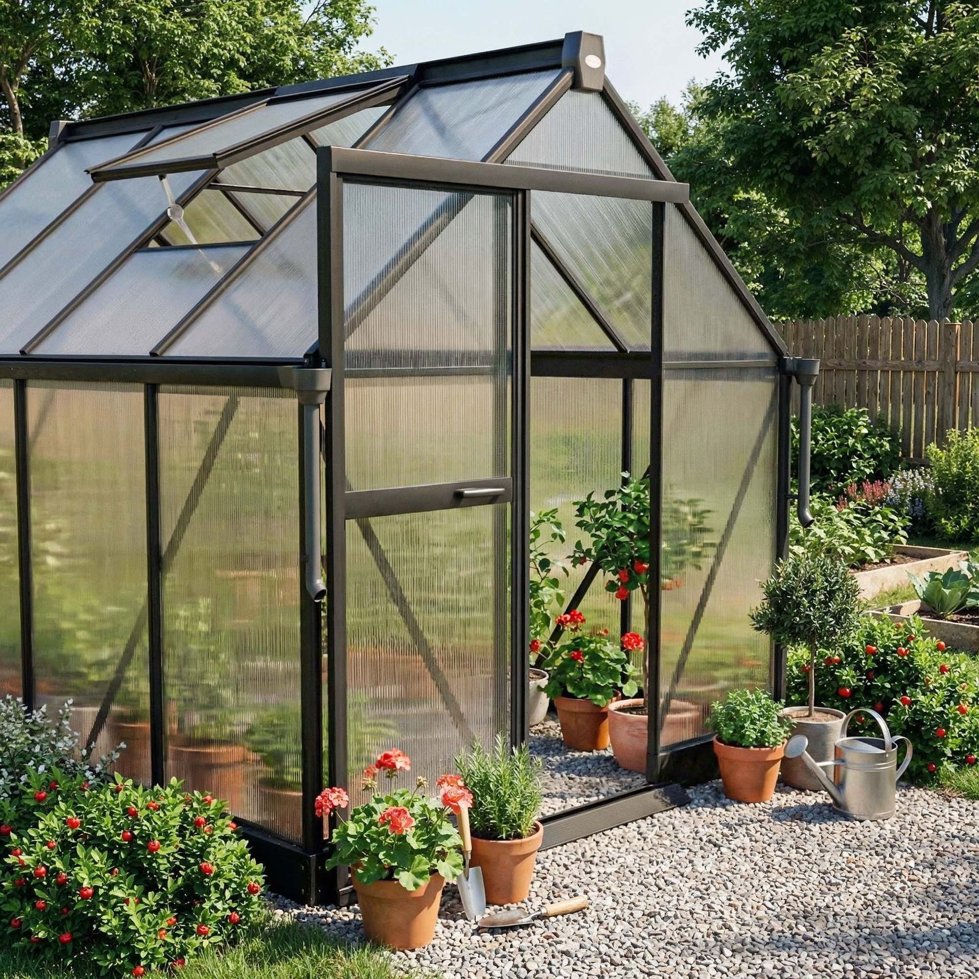 To szklarnia poliwęglanowa, która łączy prostotę, wytrzymałość i funkcjonalność. Daje komfort pracy w ogrodzie i wygodę w pielęgnacji roślin przez cały sezon.