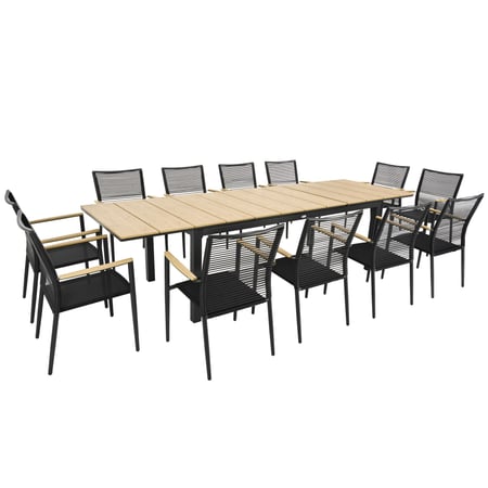 Zestaw mebli ogrodowych Basita marki di volio to idealne rozwiązanie dla tych, którzy poszukują dużego, funkcjonalnego i efektownego zewnętrznego kompletu jadalnianego. Zestaw składa się z imponującego, rozkładanego stołu o długości aż do 300 cm oraz 12 komfortowych krzeseł o lekkiej, ale wytrzymałej konstrukcji. Nowoczesne materiały odporne na warunki atmosferyczne, wygodny system rozkładania stołu oraz ergonomiczne krzesła ze sznurkowym oplotem sprawiają, że zestaw ten łączy estetykę, trwałość i praktyczność. Doskonale sprawdzi się zarówno w ogrodach, jak i na przestronnych tarasach.