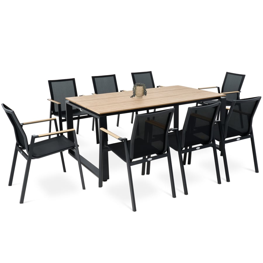 Zestaw mebli ogrodowych Perugia 8+1 to komplet składający się z dużego stołu z blatem z polywood oraz sześciu aluminiowych krzeseł z podłokietnikami.
