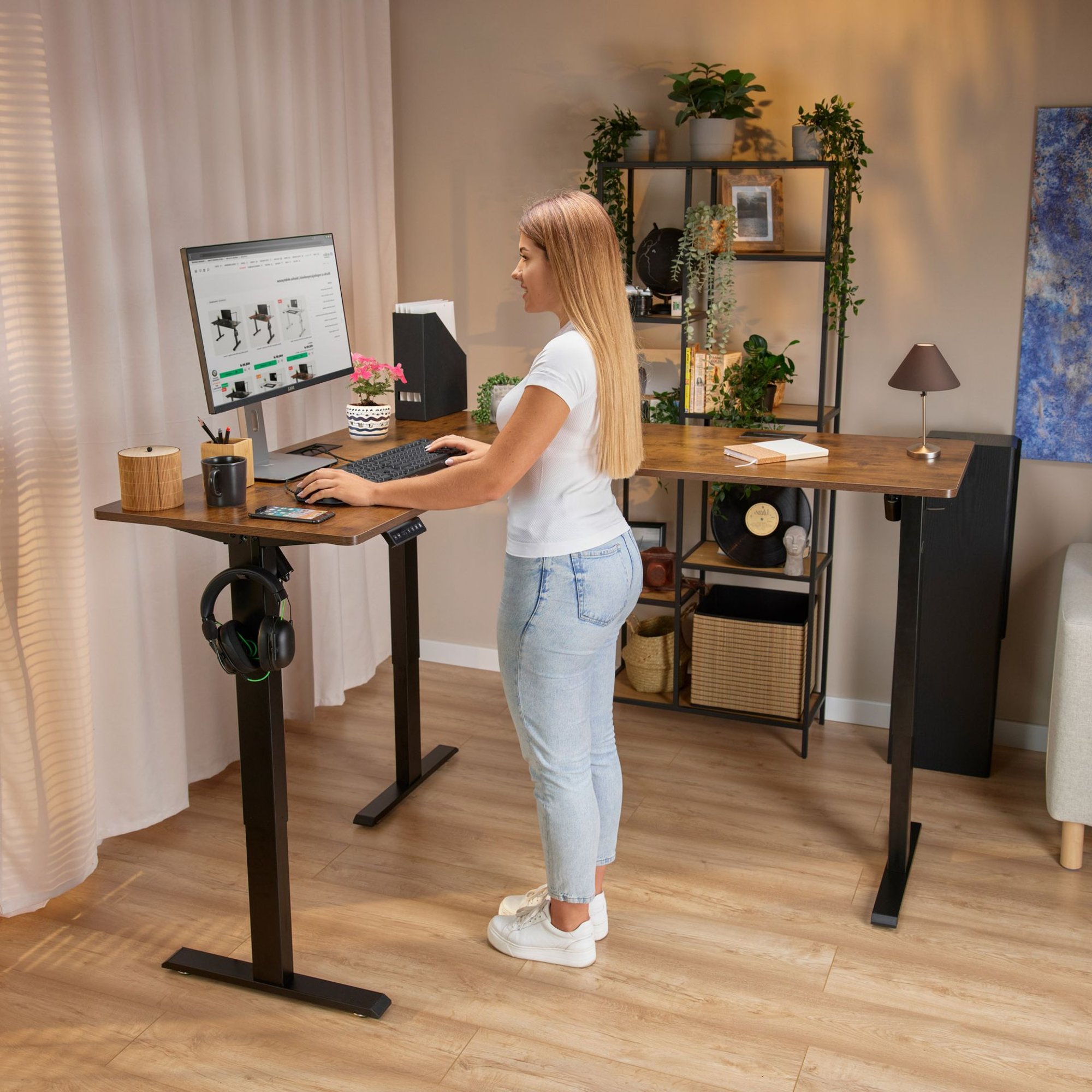 Rohový písací stôl Montaro je vybavený elektrickým mechanizmom, ktorý umožňuje plynulé a rýchle nastavenie výšky v rozsahu od 70,5 cm do 113 cm. Vďaka tomu si ho ľahko prispôsobíte svojej výške aj štýlu práce – či už pracujete posediačky alebo postojačky.