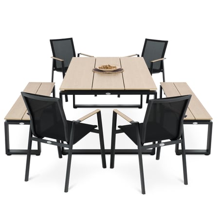 Sada záhradného nábytku Vasto od di volio je veľká rozsiahla zostava, ktorá obsahuje veľký jedálenský stôl, štyri pohodlné stoličky s podrúčkami a dve priestranné lavice. Starostlivé, masívne spracovanie a použitie kvalitných materiálov, ako je hliník, polywood imitujúci prírodné drevo a textílie, dodávajú nábytku nielen estetický vzhľad, ale taktiež zaisťujú jeho životnosť a odolnosť voči rôznym poveternostným vplyvom. Štýl nábytku, vychádzajúci z moderného minimalizmu, kombinuje jednoduché formy a tlmené farby, obmedzené na klasickú čiernu a béžovú odrážajúcu prírodný, svetlý odtieň dreva. Tento dizajn dodáva nábytku Vasto univerzálny charakter, vďaka čomu je dokonalým doplnkom každej záhrady alebo terasy a poskytuje pohodlné miesto na sedenie a jedlo pre celú rodinu a hostí.