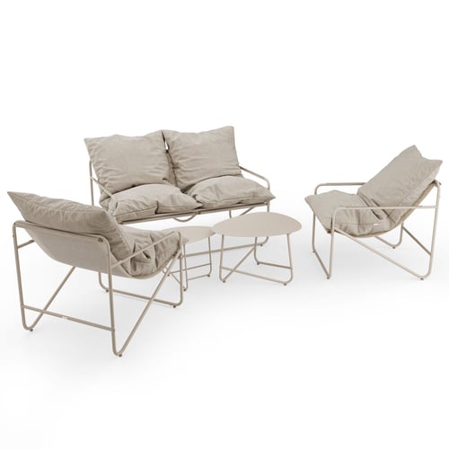 Tento komplet záhradného nábytku vytvára pokojnú a zladenú zostavu, v ktorej sa dá ľahko spomaliť tempo. Matná béžová farba rámu, podrúčok aj stolíkov pôsobí ľahko a zároveň elegantne, takže sa záhradný nábytok na terasu harmonicky spája so zeleňou, drevom aj svetlými doplnkami. Kovová konštrukcia s elektroforetickou vrstvou a práškovou povrchovou úpravou podporuje dlhú životnosť aj odolnosť pri každodennom používaní vonku, sezónu po sezóne, bez straty estetiky.