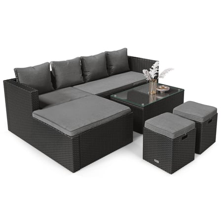 Sada záhradného nábytku Bologna čierno- šedý Vám poskytne pohodlie a relax počas posedenia s rodinou a priteľmi. Súprava obsahuje pohovku, dva sedacie pufy a kávový stolík.