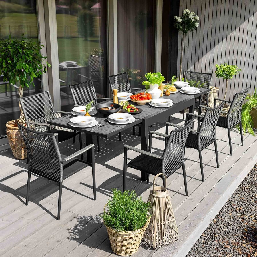 Elegantný set záhradného nábytku Gavo 8+1 - veľký rozkladací jedálenský stôl a stoličky. Odolný a pohodlný jedálenský set nábytku pre 8 osôb do záhrady a na terasu!