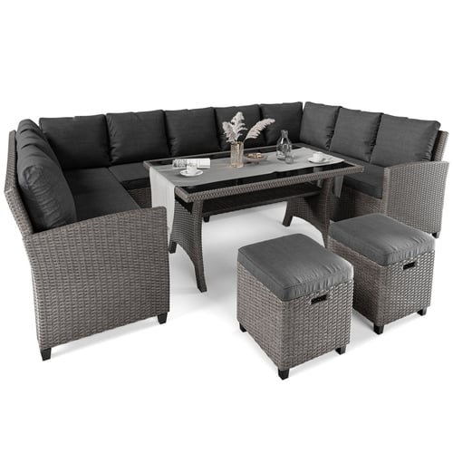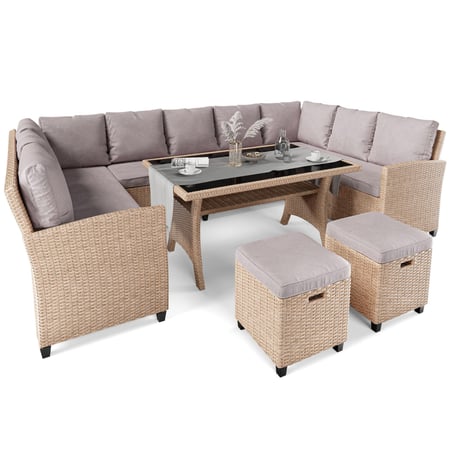 Model Livorno od di volio je veľká sada pohodlného a funkčného záhradného nábytku, vďaka ktorému bude relax a spoločné trávenie času vonku pohodlnejšie a príjemnejšie. Nábytok dobre poslúži ako vybavenie terasy, krásne sa bude vynímať aj na záhrade, kde môžete usporiadať rodinnú oslavu alebo pozvať priateľov na sezónnu grilovačku. Zostava záhradného nábytku Livorno sa skladá z 9-miestnej rohovej sedačky v tvare U, veľkého stola so sklenenou doskou a dvoch tabúľ. Nábytok je vyrobený z technoratanu, ktorý pripomína prírodný ratan, no je niekoľkonásobne odolnejší voči všetkým poveternostným vplyvom. O vysokej kvalite vlákien technoratanu svedčí ich štruktúra a tvar - zaoblené vlákna výpletu pôsobia veľmi prirodzene, čo zlepšuje estetiku nábytku. Súpravu Livorno dopĺňajú mäkké vankúše, ktoré dodávajú útulný a ležérny charakter.