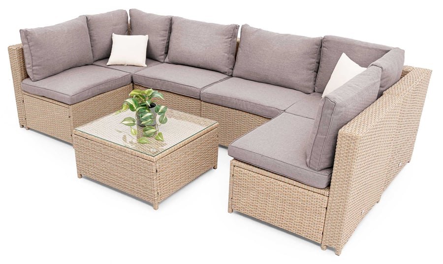 Zostava Torino od di volio je funkčná, modulárna zostava záhradného nábytku, vďaka ktorej si na terase alebo v záhrade vytvoríte vysnívané miesto pre relax a vonkajšie stretnutia. Súprava pozostáva zo šiestich prvkov, ktoré môžete ľubovoľne prestavovať a vytvárať tak formy a usporiadanie nábytku, ktoré vyhovujú vašim individuálnym potrebám. Spojením modulov vytvoríte jednu veľkú rohovú pohovku pre šesť osôb, dve väčšie pohovky alebo pohovku s kreslami. Sedadlá a operadlá sú vybavené mäkkými vankúšmi, ktoré zaisťujú pohodlie pri používaní. Trvalým prvkom, ktorý kompozíciu dopĺňa, je kávový stolík so sklenenou doskou. Kombinácia jednoduchých modernistických foriem s prírodne vyzerajúcim výpletom z technoratanu dáva súprave Torino univerzálny charakter, ktorý dobre zapadne do moderných aj tradičných aranžmánov.