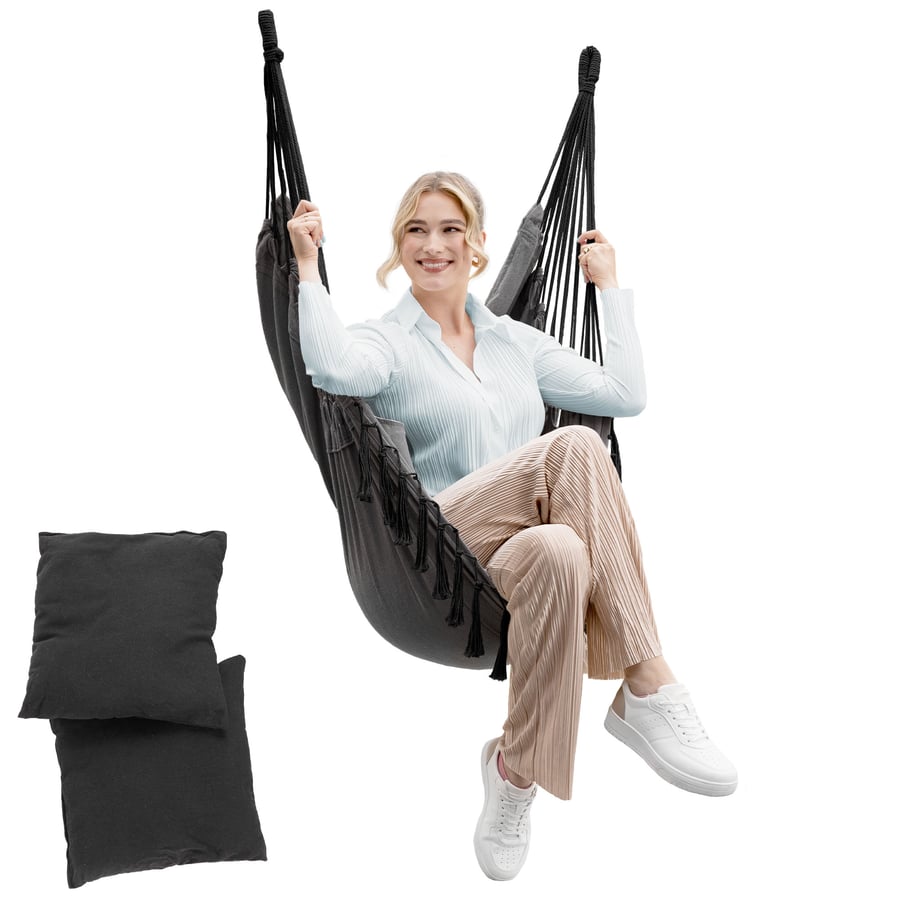 Brazílska hojdačka Fira značky di volio je atraktívne a mimoriadne pohodlné závesné kreslo, ktoré vám umožní relaxovať v pohodlí domova alebo vonku, obklopení prírodou. Hojdačku je možné zavesiť v interiéri ako originálnu alternatívu k tradičnému kreslu,ale aj v exteriéri - v záhrade, na balkóne alebo na terase. Brazílske kreslo Fira bude vďaka svojmu štýlovému dizajnu vyzerať krásne obklopené záhradnými rastlinami a dodá interiéru útulný charakter. Hojdacia sieť kresla je vyrobená z odolnej a vzdušnej látky, zdobená bavlnenými strapcami, ktoré zdôrazňujú estetiku hojdačky, odkazujúc na teplý, prírode blízky štýl boho. Hojdačka Fira je dostupná v dvoch farebných prevedeniach - svetlošedá s béžovými vankúšikmi a tmavošedá s čiernymi vankúšikmi.