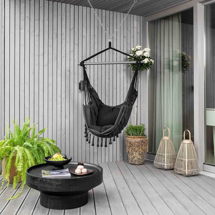 Hojdacia sieť závesného kresla vás príjemne objíme a poskytne vám pocit pohodlia pri relaxačnom hojdaní. Hojdačka je navyše vybavená dvoma farebne zladenými vankúšikmi, ktoré poskytujú dobrú oporu vášmu chrbtu, stabilizujú vašu polohu a umožňujú pohodlné sedenie v kresle. Praktické vrecko vo vnútri sedadla vám umožní vložiť knihu, telefón alebo občerstvenie a vďaka držiaku na fľašu, ktorý je súčasťou súpravy, môžete mať svoj obľúbený nápoj poruke.