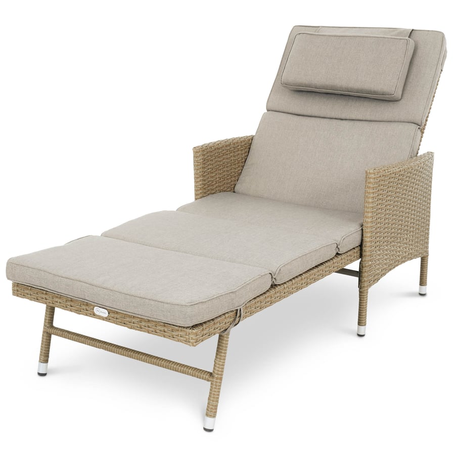 Polohovateľné záhradné lehátko Breso v odtieňoch teplej béžovej. Funkčné kreslo - pohovka, s hrubým vankúšom a mäkkou opierkou hlavy.