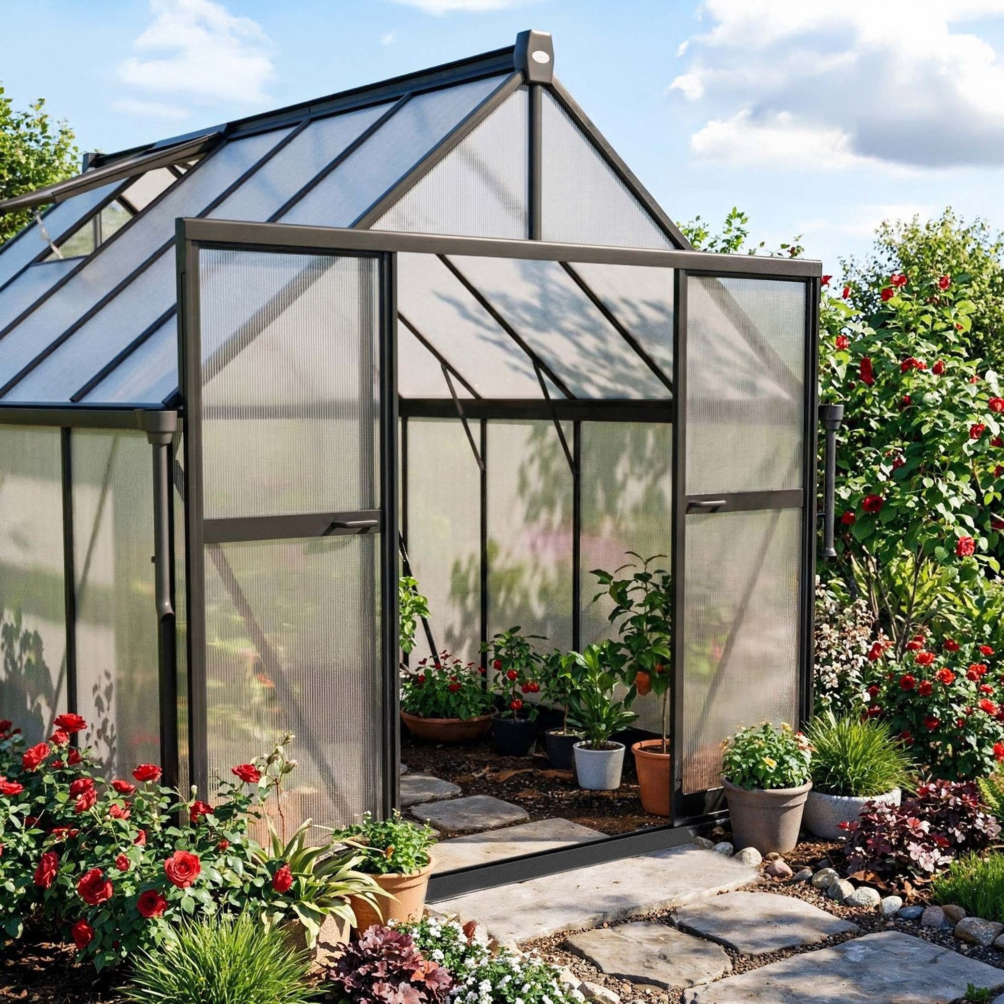 Dvojkrídlové posuvné dvere s rozmermi 172 × 110 cm zabezpečujú pohodlný vstup aj jednoduché prenášanie debničiek a náradia. Dve výklopné strešné okná 61 × 56 cm pomáhajú udržať stabilnú mikroklímu. Ide o záhradný polykarbonátový skleník, navrhnutý pre komfortnú prácu v záhrade.