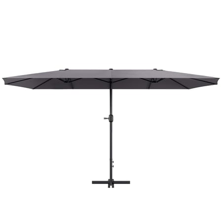 Veľký záhradný slnečník Castela DV-147GU v šedom odtieni poskytuje široký tieň na terase pre celú oddychovú zostavu. Rozmery 450 × 265 cm a výška 240 cm zaručujú maximálny komfort bez obmedzení. Krížová základňa stabilne podopiera celú konštrukciu. Polyesterová strecha s UV filtrom 50+ chráni pred slnkom a ventilačný otvor podporuje prúdenie vzduchu. Pevná oceľová konštrukcia s ochranou proti korózii udrží slnečník v perfektnom stave po dlhé roky.